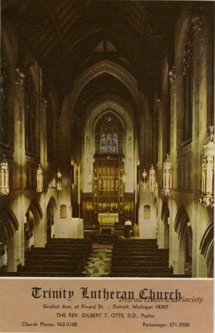 Pamphlet about the architecture of Trinity Lutheran Church. Front cover features a color photo of the interior looking from the balcony toward the altar.