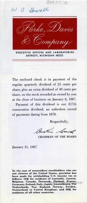 Pamphlet included with quarterly dividend checks mailed to Parke, Davis & Co. stockholders. Includes a message from the chairman of the board, information about recent employee hires and retirements, and a description of the Centennial exhibit.
