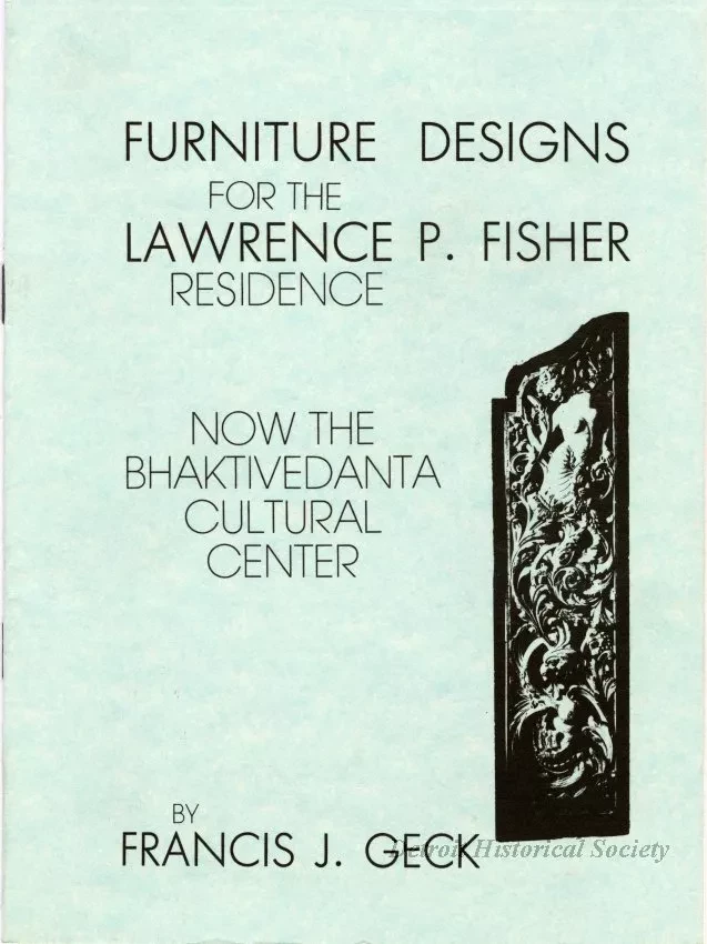 Booklet containing black and white photographs and reproductions of sketches for the furniture designed by Francis J. Geck for the Lawrence P. Fisher Mansion, as well as brief passages about the commission, and the artist, the latter credited to James E. Conway, architectural curator of the Detroit Historical Museum. The book is bound in a green paper cover a monochromatic images of one of the home's gates on the cover, and of the home on the back.