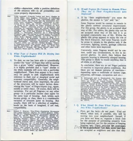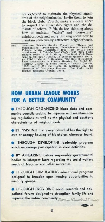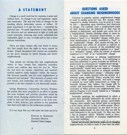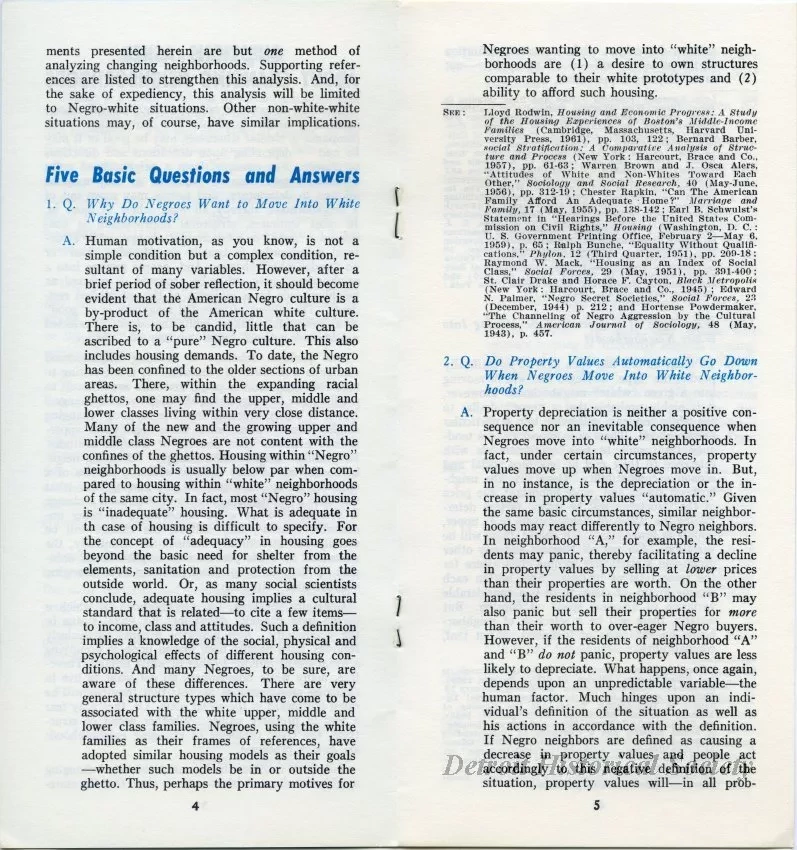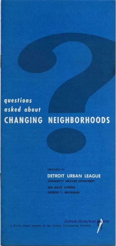 Half-folded 8-page staple-bound pamphlet titled, "Questions Asked About Changing Neighborhoods," written by George Henderson and published by the Detroit Urban League's Community Service Department. The pamphlet is targeted at white readers and is intended to assuage fears and concerns that arose as African Americans moved into predominately white neighborhoods. The pamphlet opens with a statement from Detroit Urban league Executive Director Frances A. Kornegay, followed by an introduction titled, "Questions about Changing Neighborhoods," and "Five Basic Questions and Answers." The questions are, "Why Do Negroes Want to Move Into White Neighborhoods," "Do Property Values Automatically Go Down When Negroes Move Into White Neighborhoods," "What Type of Negroes Will Be Moving Into White Neighborhoods," "Would Negroes Be Content to Remain Where They Are If Their Neighborhoods were Improved," and "What Should Be Done When Negroes Move Into White Neighborhoods." Each question is accompanied by a passage answering the matter, which includes suggestions for further readings. The pamphlet ends with a list of six bullet points enumerating "How Urban League Works For A Better Community." The pamphlet's cover features a large dark blue question mark against a lighter blue background. Text on the cover provides the Detroit Urban League's address as "208 Mack Avenue, Detroit 1, Michigan."