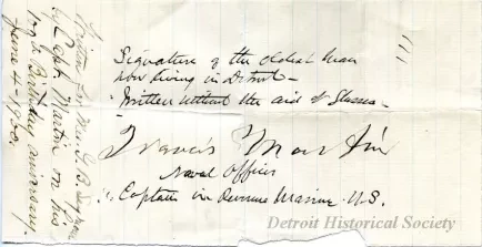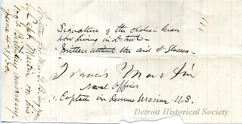 This partial sheet of writing paper has been torn from a larger sheet. It has light blue lines and a watermark that shows the image of a spinning wheel and the name, "Crane's." A handwritten note across the center shows "Signature of the oldest man now living in Detroit - written without the aid of glasses - Francis Martin, Naval Officer, Captain in Revenue Marine, U.S." Another handwritten note along the left edge shows "Written for Mrs. G. B. Seymour by Capt. Martin on his 100th Birthday Anniversary. June 4, 1900."
