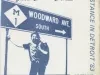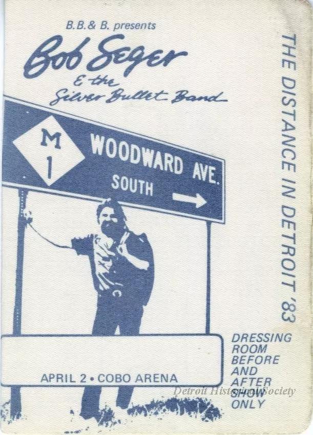 Satin cloth adhesive backstage pass for the April 2, 1983 Bob Seger and the Silver Bullet Band concert at Cobo Arena. Seger is pictured in blue on white leaning on a Woodward Avenue sign. "The Distance in Detroit '83" is printed along the right edge. "Dressing room before and after show only" is printed in the lower right. The pass is still on its backing.
