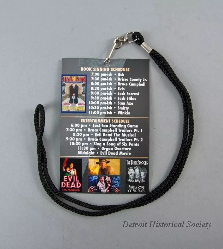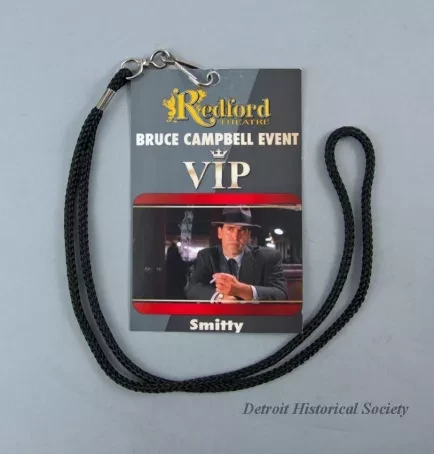 1 - VIP Pass from the "Bruce Campbell Event" at the Redford Theatre on August 29, 2017. The multicolor pass features a color photograph of Bruce Campbell's character, "Smitty" from The Hudsucker Proxy, on the front with the book signing and entertainment schedule shown on the back. The pass includes a black cord neck strap.