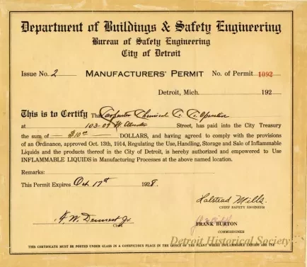 Manufacturers' Permit, mounted on linen, issued by Bureau of Safety Engineering of the Department of Buildings and Safety Engineering of the City of Detroit on October 17, 1928, declaring that the Carpenter Chemical Company Corporation at 103-9 West Atwater Street has paid ten dollars to the City of Detroit as per a 1914 ordinance regulating inflammable liquids. The permit is printed with the signature of Halstead Mills, the City Safety Engineer, stamped with that of Frank Burton, the commissioner, and signed by F.W. Dennest Jr., the clerk.
