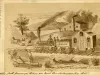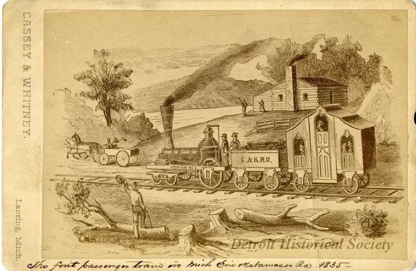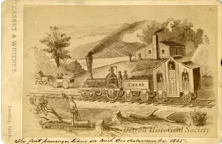 Cabinet card bearing a sepia-toned photo of an engraving by L. Wright of New York showing the Erie and Kalamazoo Railroad locomotive Adrian No. 1, the state's first locomotive entering service in 1837, pulling a passenger car. A man in the foreground takes a break from chopping wood to wave to the train, as other figures wave in the background form a horse-drawn cart, and a log cabin. The photo is on a Cassey and Whitney of Lansing, Michigan card. "The first passenger train in Mich. Erie Kalamazoo Ra. 1835[sic]," is handwritten along the edge of the card beneath the image. "Compliments of W.C. Ransom, Dep. Commissioner of Railroads, Michigan," is stamped and "C.N.O. Rice," is handwritten on the verso.