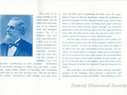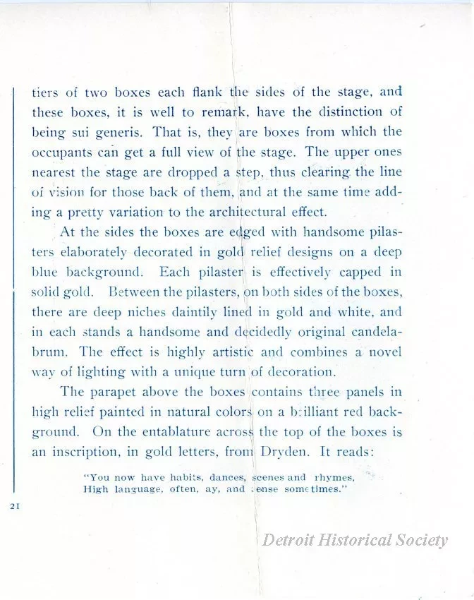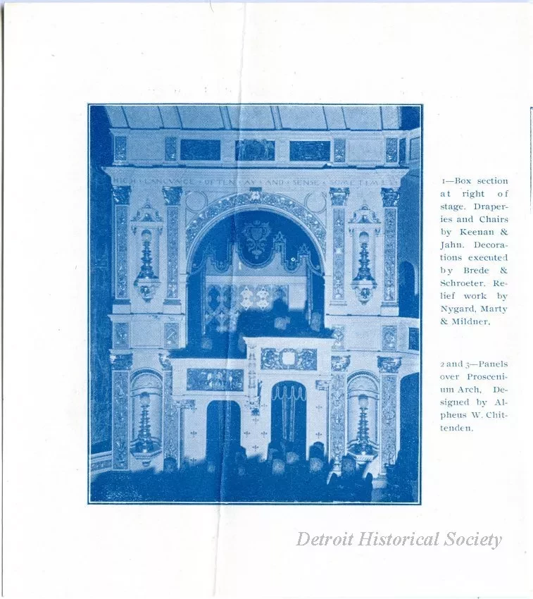 This cyan halftone picture was cut from a page and shows a view of one wall inside the new Detroit Opera House. Some of the architectural details of the new Opera House (built in 1898) are described in the text that is printed adjacent to the picture and on the verso.