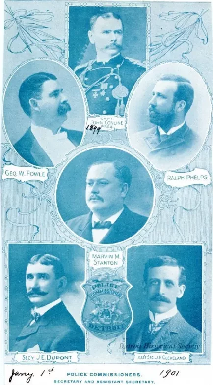This cyan halftone picture was cut from a page and shows a group of head and shoulders images. The pictured individuals include four Police Commissioners: Capt. John Conline, George W. Fowle, Ralph Phelps, and Marvin M. Stanton as well as Secretary, J. E. Dupont and Assistant Secretary, J. H. Cleveland. A handwritten date beneath John Conline's image shows "1899" and a handwritten date at the bottom of the cutout shows "Jany. 1st 1901."