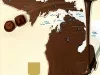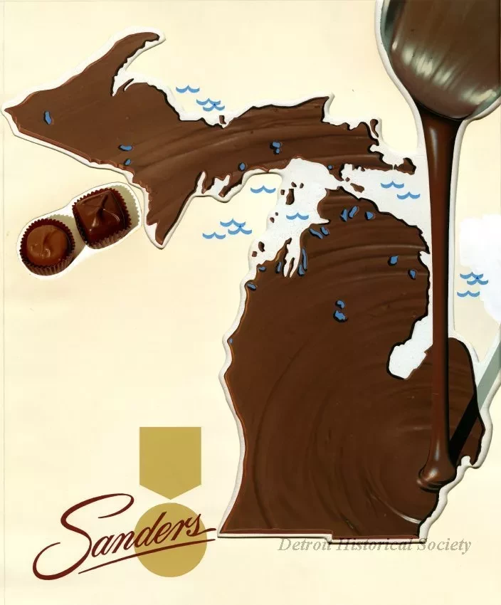 1 - Sanders advertising art; the picture shows a large ladle pouring a stream of chocolate into a map outline of Michigan, a typewritten label on the brown paper cover shows: "Fred Sanders 4-clr art Covering the State with Choc. Used for Det. News ROTO - Apr. 1966", the cover also has a company label that shows: "Palmer, Willson & Worden, Inc. 1600 Penobscot Building Detroit, Michigan 48226".