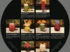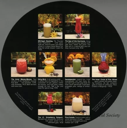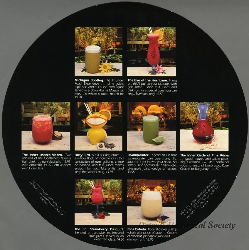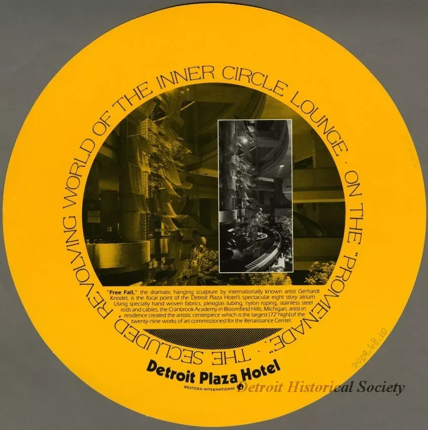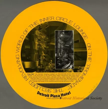 Circular placemat from the Western International Detroit Plaza Hotel's Inner Circle Lounge on the Renaissance Center's promenade. The recto is yellow with a monochromatic photo of the Gerhardt Knodel hanging sculpture Free Fall which was displayed within the hotel's atrium. A cocktail menu with photos and descriptions of eight drinks, including the Dirty Bird, which was served in a bird-shaped mug, is on the verso.