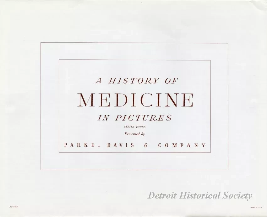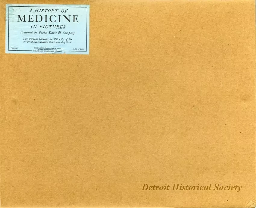 Portfolio containing the third set of six art print reproductions from the series, "A History of Medicine in Pictures", presented by Parke, Davis & Co. Directed by George A. Bender, paintings by Robert A. Thom. Includes descriptive articles to be clipped and attached to the back of framed pictures, and suggestions for framing prints.
