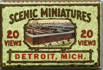 Miniature color souvenir folder containing 20 image cards depicting factories, Belle Isle, street views, and buildings. The thin edges of the folder are bordered with swastikas.