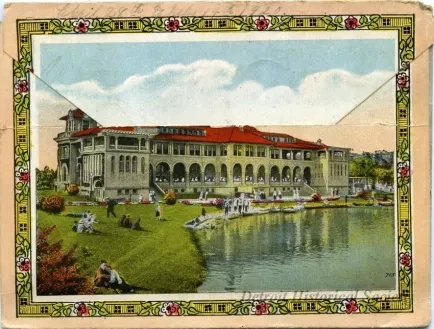 Color souvenir folder showing ships at the riverfront on the postage side, and the Belle Isle Casino from Canal on the fold side.