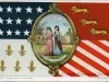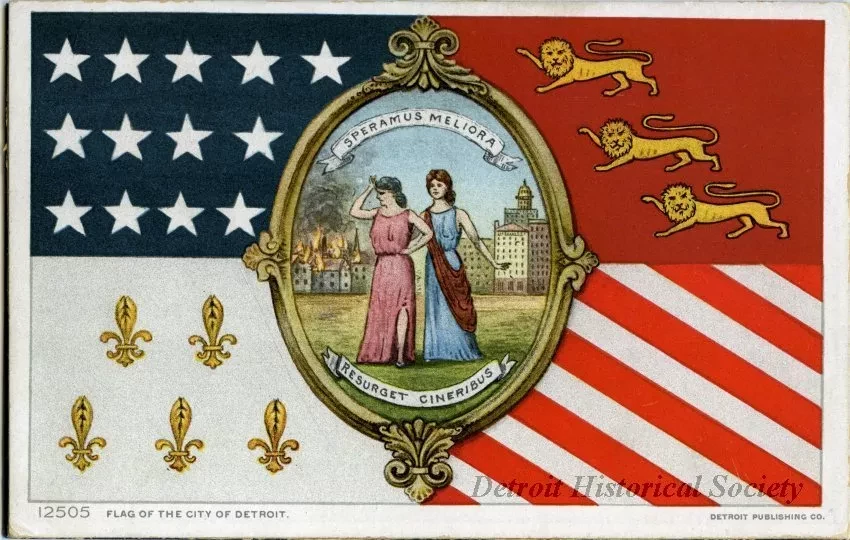 Mounted color postcard, from the Detroit Publishing Company, depicting the flag of Detroit, with the city seal emblazoned on a quartered background. The background features three golden lions, five golden fleurs-de-lis, stars, and stripes. The seal has the text "Speramus Meliora; Resurget Cineribus" and two female figures with a burning city and new city behind them.