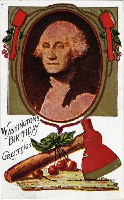 Postcard printed with a portrait of George Washington above an image of an ax and cherries, with the message, "Washington's Birthday." The verso is divided, and unpostmarked, with the handwritten message, "From Frank, to Grandma."