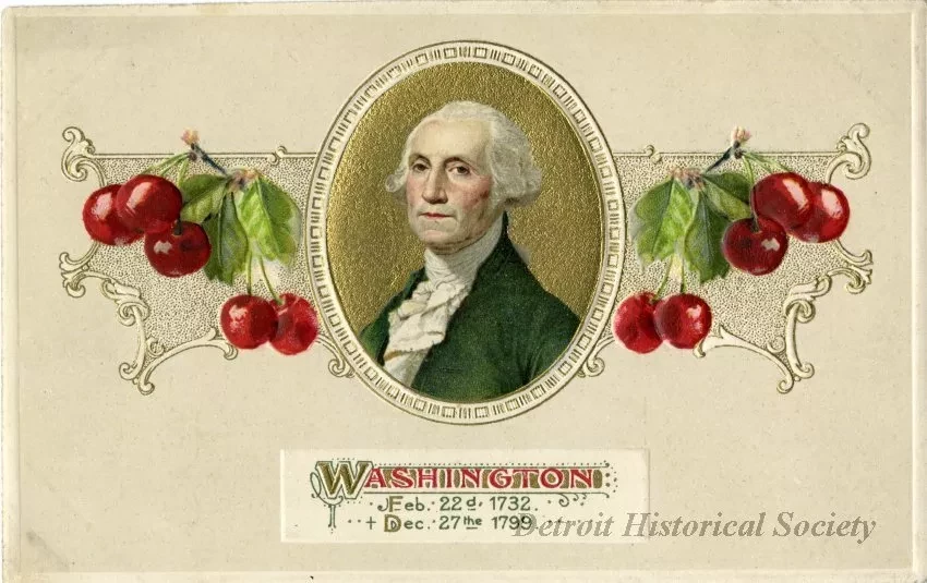 Postcard printed with a portrait of George Washington surrounded by cherries. A caption below reads, "Washington: Feb. 22d 1732 - Dec. 27the 1799." The verso is divided, has not been filled out, and is printed with the mark, "printed in Germany."