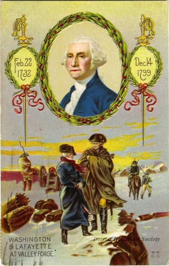 Postcard printed with a portrait of George Washington flanked by the dates of his birth and death, above an image captioned "Washington and Lafayette at Valley Forge." The verso is printed with the message, "Special Washington Birthday Services, First Baptist Bible School, Woodward and Pingree, 11:50 a.m. to 1 p.m., Sunday, Feb. 22, Orchestra and Chorus 100 Voices, Splendid Program. Come.," addressed to Dr. C.G. Hampton of 24 Blaine Avenue, and postmarked February 19, 1914.