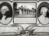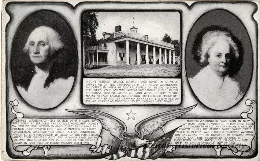 Postcard printed with black and white portraits of George Washington and Martha Washington, as well as a photograph of their home at Mount Vernon, all with lengthy captions, printed by M.T. Sheahan of Boston. The card is postmarked February 20, 1909, from Detroit, Michigan, and a handwritten message addressed to C.G. Hampton is on the verso, "Suppose you'll celebrate."