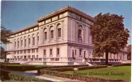 Printed on verso: The Detroit Public Library. Main Building, Detroit, Michigan. Of Italian Renaissance style architecture, the main building is one of the showplaces of Detroit.