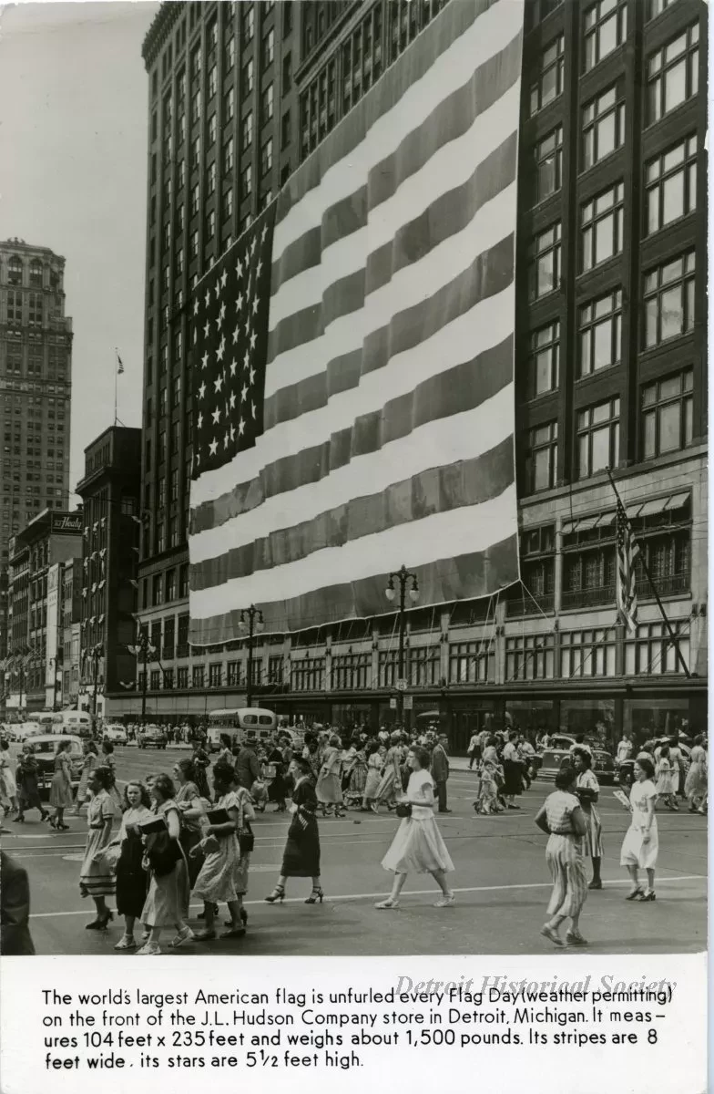 Printed on recto: The world's largest American flag is unfurled every Flag Day (weather permitting) on the front of the J.L. Hudson Company store in Detroit, Michigan. It measures 104 feet x 235 feet and weighs about 1,500 pounds. Its stripes are 8 feet wide, its stars are 5 ½ feet high.
