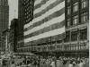Black and white photographic postcard depicting the Hudson's Building from Woodward Avenue with a large American Flag attached to the building façade. On the street are many pedestrians, cars, and buses, and the David Broderick Tower is visible in the background.