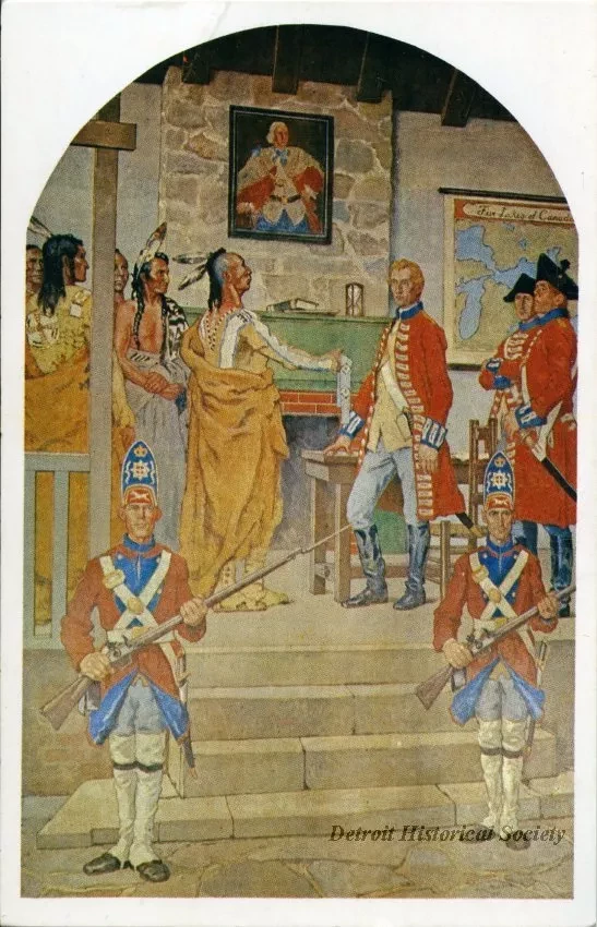Printed on verso: The Detroit Public Library; 5201 Woodward Avenue, Detroit 2, Michigan; The Conspiracy of Pontiac: a mural by Gari Melchers (1860-1932) Adam Strohm Hall, Main Library.