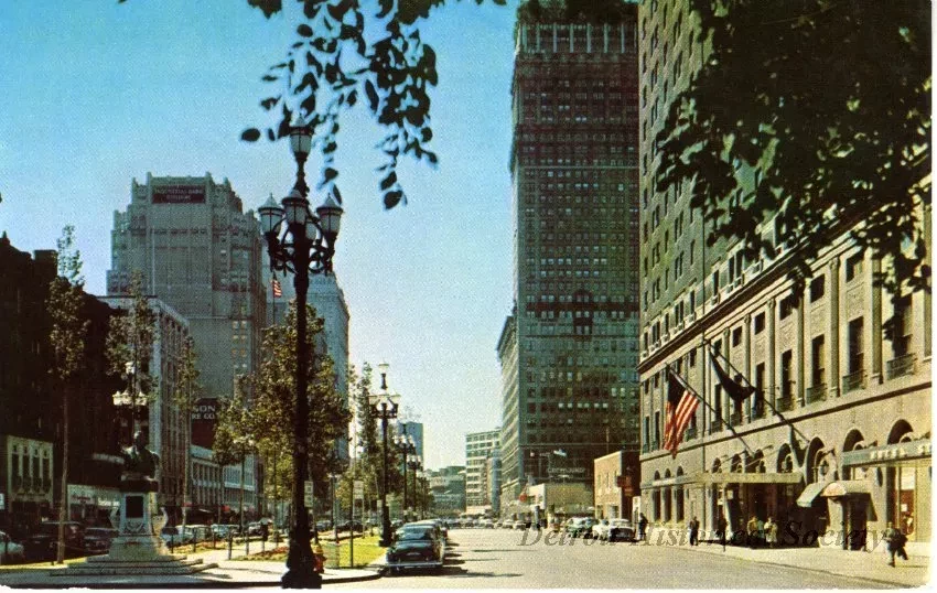 Printed on verso: Washington Boulevard, Detroit, Michigan. This spacious boulevard is a fine parkway lined with wonderful shops - and at night one of the most brilliantly lighted thoroughfares to be found in any city.