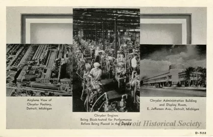 Black and white postcard depicting three images captioned "Airplane View of Chrysler Factory, Detroit, Michigan", "Chrysler Engine being Block-tested for Performance Before Being Places in the Chassis", and "Chrysler Administration Building and Display Room, E. Jefferson Ave., Detroit, Michigan".