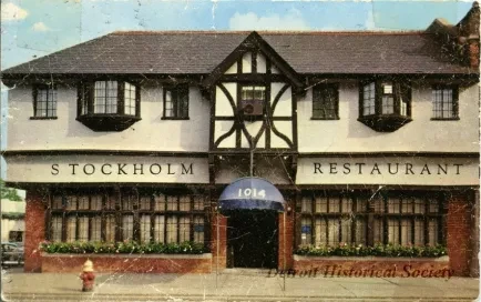 Printed on verso: The Stockholm; 1014 E. Jefferson Ave. Detroit 7, Mich. Famous from Coast to Coast for Swedish Smorgasbord - Beef Steak, Duck, Lobster, Homemade Desserts. Luncheon - Dinners - Sunday Dinners; Closed Mondays. Complete Bar Service.