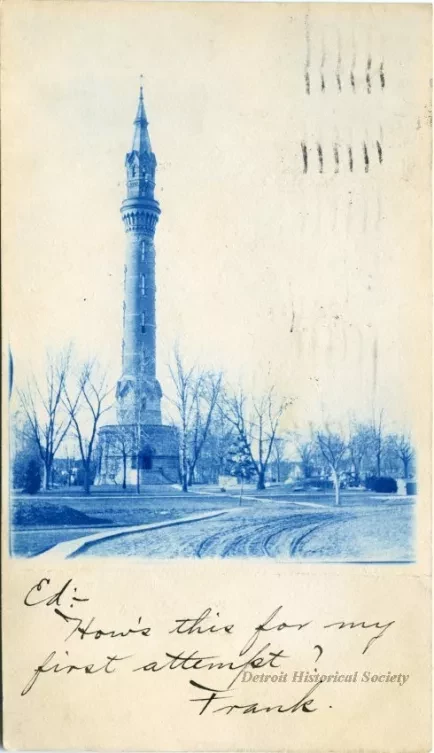 Monochromatic postcard depicting the tower in Water Works Park, with a dirt road in the foreground.