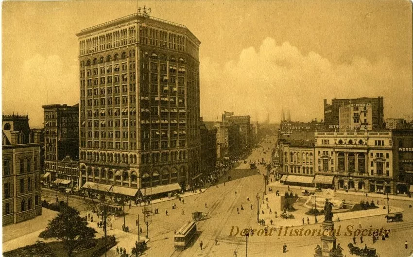 Sepia colored monochromatic postcard depicting an elevated view of Campus Martius, facing northwest. The street is filled with pedestrians and streetcars.