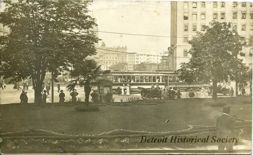Black and white photographic postcard depicting the landscaped park in front of City Hall, facing east. In the background are the Wayne County Building, Hotel Pontchartrain, streetcars and pedestrians. In the foreground are flower beds.