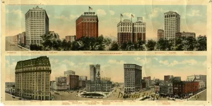 Color postcard containing illustrations of buildings located near Grand Circus Park and Cadillac Square. The top half of the postcard features a view of Grand Circus Park, with depictions of the David Whitney Building, the Cadillac Hotel, the Hotel Statler, the Hotel Tuller, the Hotel Charlevoix, the Kresge Building, and the Fine Arts Building. The bottom half of the postcard features a view of Cadillac Square, with depictions of the Hotel Pontchartrain, the Ford Building, the Hammond Building, the Penobscot Building, old City Hall, the Dime Savings Bank Building, the Free Press Building, the Majestic Building, the Detroit Opera House, the Hudson Building, and Temple Theatre. Text along the top left border of the postcard reads "Photos by courtesy of Detroit Convention and Tourists' Bureau, Detroit, Mich."