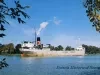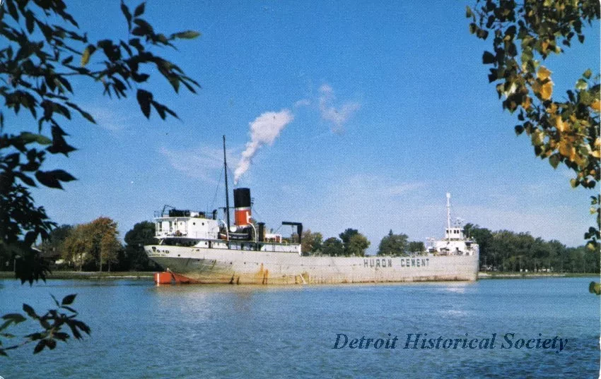 One postcard with a color photographic image of the bulk carrier steamship, SS J. B. Ford, of the Huron Portland Cement Company. The photo shows a starboard quarter view of the ship which is underway in fair weather. Trees are visible in the foreground and a shoreline is visible in the background. Black printed text on the verso reads "Welland Canal, Ontario, Canada - Key Link of the Largest Inland Waterway in the World" and "The American carrier J.B. Ford downbound between lock 1 and 2 provides a picturesque view of this important link between the heartland of North America and the seas of the world." The card was "Printed in Canada by Design Library, Inc., 1285 Matheson Blvd., Missisauga, Ont L4W 1R1."