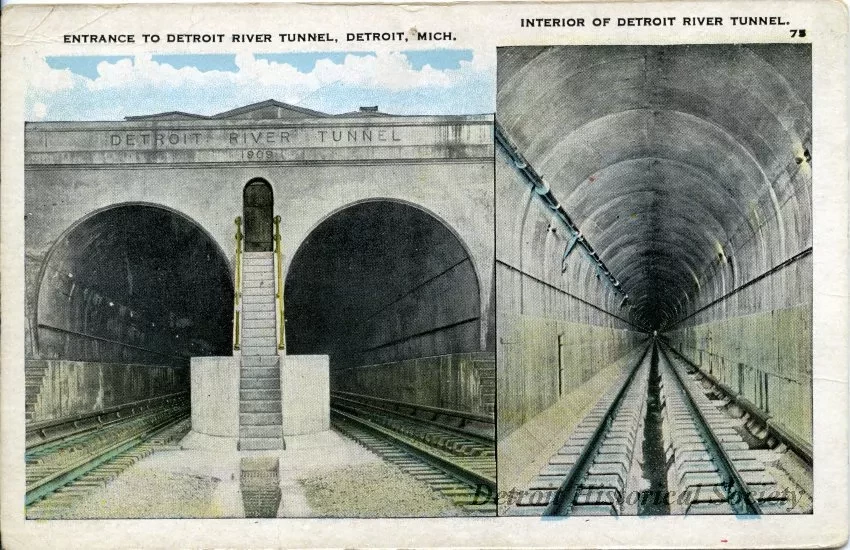 Color postcard depicting two images of the Michigan Central Railway Tunnel, with captions reading "Entrance to Detroit River Tunnel, Detroit, Mich." and "Interior of Detroit River Tunnel."