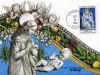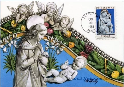 First Day Cover postcard for the Christmas 1985 stamp of Luca della Robbia's Madonna and Child, from the collection of the Detroit Instiute of Arts. The postcard contains a print of Tom McNeely's painting of the Madonna and Child with white flowers, fruit, and three winged putti. Affixed to the upper right corner of the recto is the a stamp of Luca della Robbia's relief, canceled October 30, 1985, Detroit Michigan.