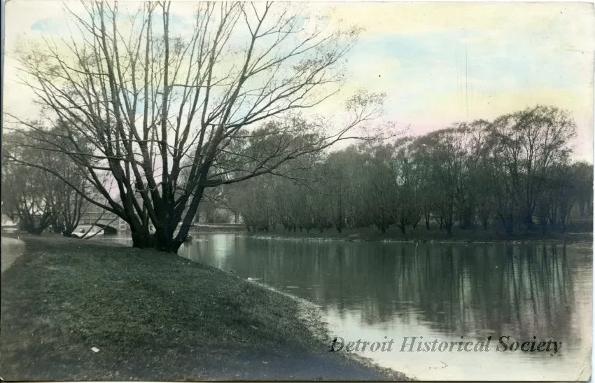 Request ImageColorized black and white photographic postcard depicting a canal on Belle Isle lined with trees. In the background is a bridge.