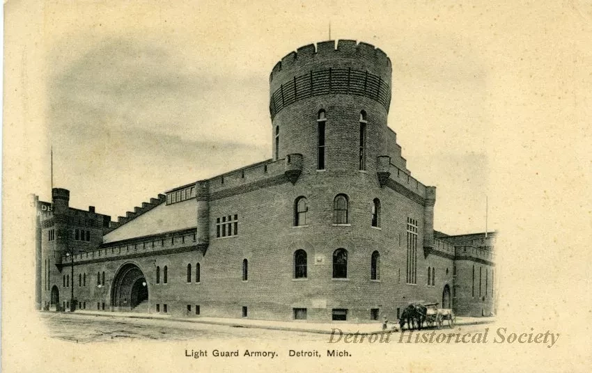 Black and white postcard depicting the Light Guard Armory from the corner of E Larned and Brush Streets, with a horse-drawn cart parked in front.
