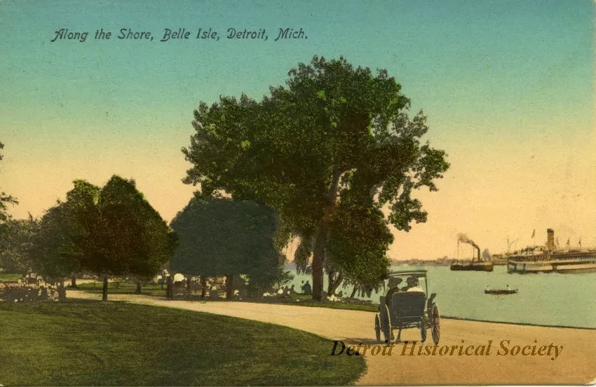 Printed on verso: Along the Shore, Belle Isle, Detroit's principal recreation spot. The island is located in the Detroit river near lake St. Clair, and it connected with the city by a bridge 8 feet less than half a mile in length. It comprises 702 acres, is over two miles long and boasts over thirty miles of fine macadam roadway which completely circles and frequently intersects it. A fine zoo, aquarium, horticultural building, swimming and skating pavilions, casino and boat livery are in connection. The City has expended over $1,500,000 on it since its purchase in 1879.
