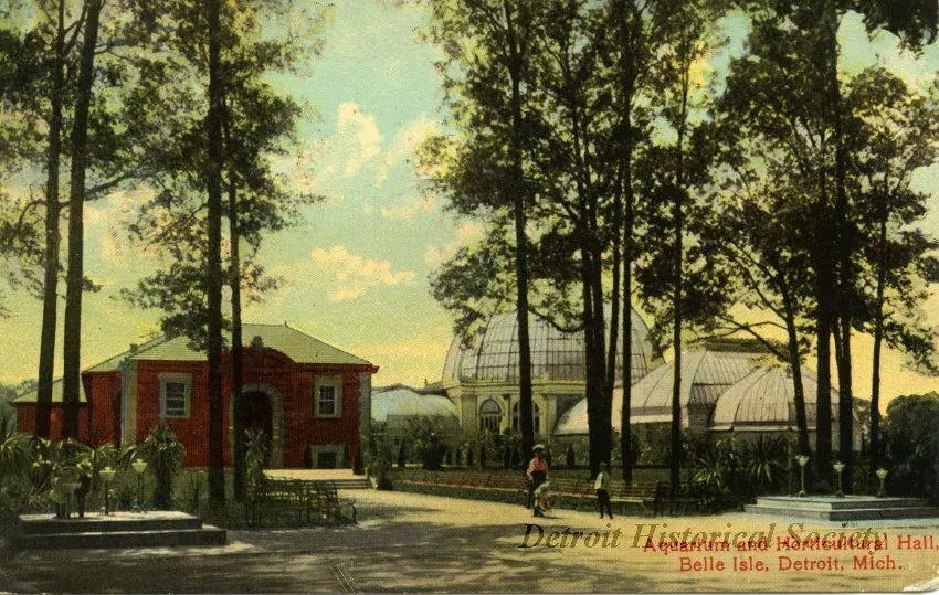 Printed on verso: Aquarium and Horticultural Hall, Belle Isle. Belle Isle is in the Detroit River between Detroit and Windsor, Canada. The island contains 702 acres and is entirely covered with one of the most beautiful parks in the United States, having some 21 miles of Macadam Roads; a magnificent Casino; Pavilions; Boat Houses; Aquarium, Horticulture Hall and Zoological Gardens. The island was purchased by Detroit in 1879, and has since then expended $1,600,000 in beautifying it.