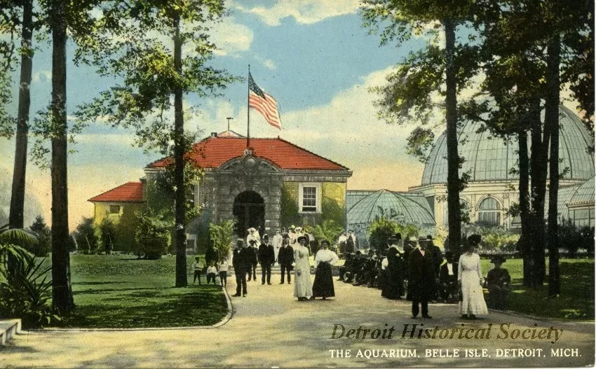 Printed on verso: The Aquarium, Belle Isle, Detroit, Mich. The Aquarium contains specimens of live fish of all kinds and is one of the most interesting studies on the island. All sight seeing cars stop here.
