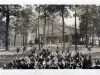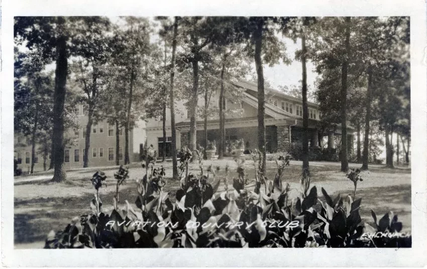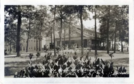Postcard. Photographic print on cardstock depicting the Aviation Country Club in West Bloomfield, with flowers in the foreground and several trees in front of the clubhouse. Printed on the recto, "E. H. Church."