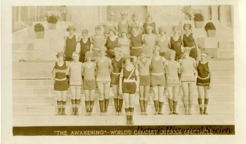 Sepia-toned photo postcard from a souvenir set from the 1923 water ballet and circus performance, "The Awakening," depicting 25 of the performers--women in bathing suits and hats--posed on the steps of their set at Shadukiam Grotto Stadium at West Davison Ave and Dexter Boulevard. "'The Awakening' presented by Shadukiam Grotto, Detroit, 1923. 17420 chair seats, 1000 participants--water stunts, circus acts, ballets, fireworks. Conceived and managed by N.C. Chapman. Photo by MacGregor & Vallin," is printed on the verso. The set of three cards were housed in a beige paper envelope with "The Awakening 1923, Photographic Mailing Cards, Price $1.00 Per Set," printed on them, and "Ruth McMeans, 326 El Cerrito, Piedmont, Calif." handwritten on them.