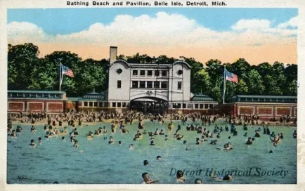 Request ImageColor postcard depicting the Bath House on Belle Isle, with swimmers and the Detroit River in the foreground.