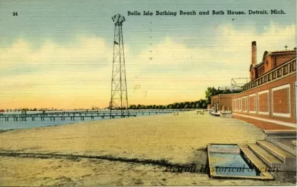 Printed on verso: The bath house and bathing beach on world famous Belle Isle Park provides warm weather recreation which draws Detroiters to the island by the thousands. Illuminated for night bathing, the beach s open from 9 a. m. to 9 p. m. Maintained by the Department of Parks and Recreation, Detroit, Michigan.