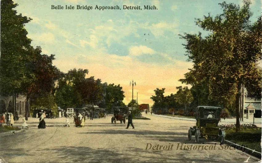 Printed on verso: Belle Isle Bridge Approach, Detroit, Mich. There is a continual stream of Vehicles and Automobiles crossing the bridge to Belle Isle during the summer months to enjoy the twenty-five miles of fine macadamized driveways that border the shore and pierce the forests of this beautiful Park Considered the finest in the country.