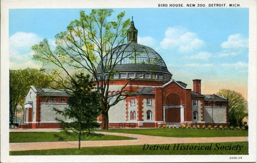 Click to enlarge 2012.046.821 Postcard Bird House, New Zoo, Detroit, Mich. Color postcard depicting the Bird House at the Detroit Zoo. Date c. 1930 Collection Postcard Search Terms Detroit Zoo, Royal Oak Request Image