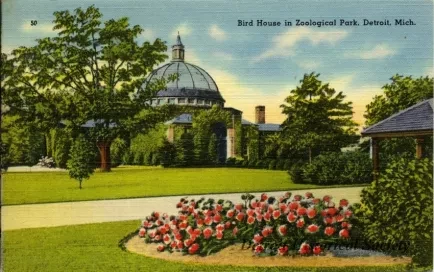 Color postcard depicting the Bird House at the Detroit Zoo, with a flower bed in the foreground.