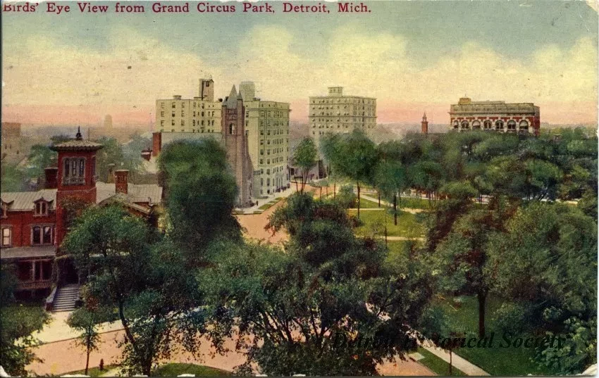 Printed on verso: Grand Circus Park is one of the many beauty spots to be found in the down-town section of the city. The park is surrounded by a number of magnificent buildings, and reading from left to right is the Michigan Conservatory of Music, Church of Our Father, Hotel Tuller, the Charlevoix Apartments and Fine Arts Building.