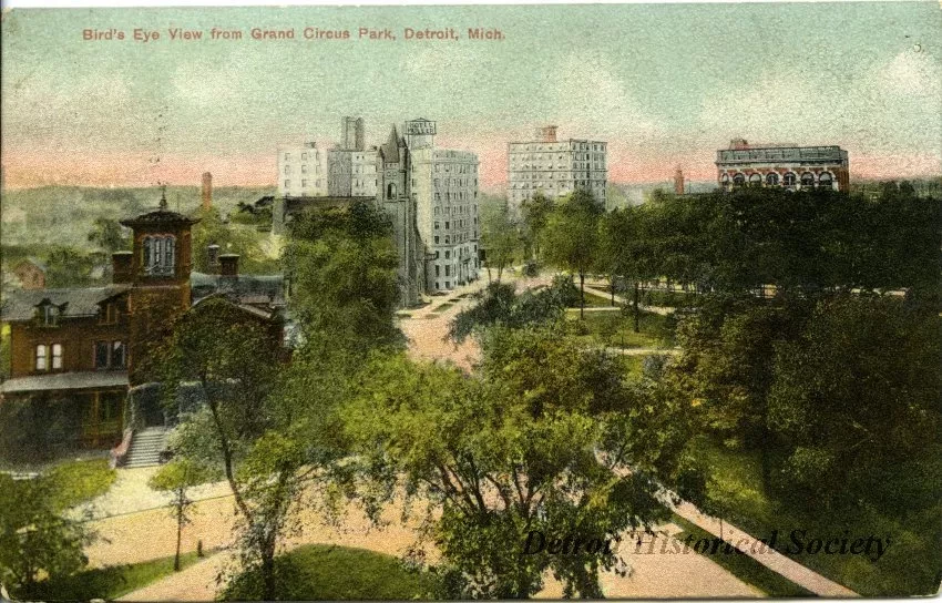 Printed on verso: Grand Circus Park is one of the many beauty spots to be found in the down-town section of the city. The park is surrounded by a number of magnificent buildings, and reading from left to right is the Michigan Conservatory of Music, Church of Our Father, Hotel Tuller, the Charlevoix Apartments and Fine Arts Building.