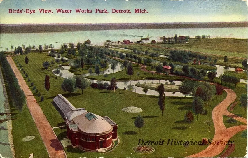 Printed on verso: Birds'-Eye View, Water Works Park. The 72-acre plot of ground on Jefferson Avenue, owned by the city and partially occupied by its water works pumping station, has been made one of Detroit's beauty spots. The water supply is pumped through a long tunnel from the intake pipe in Lake St. Clair to the distributing point. The ponderous machinery can pump 102,000,000 gallons of water in 24 hours. This view was taken from the tower, showing the library in lower left hand corner and Belle Isle in the distance.